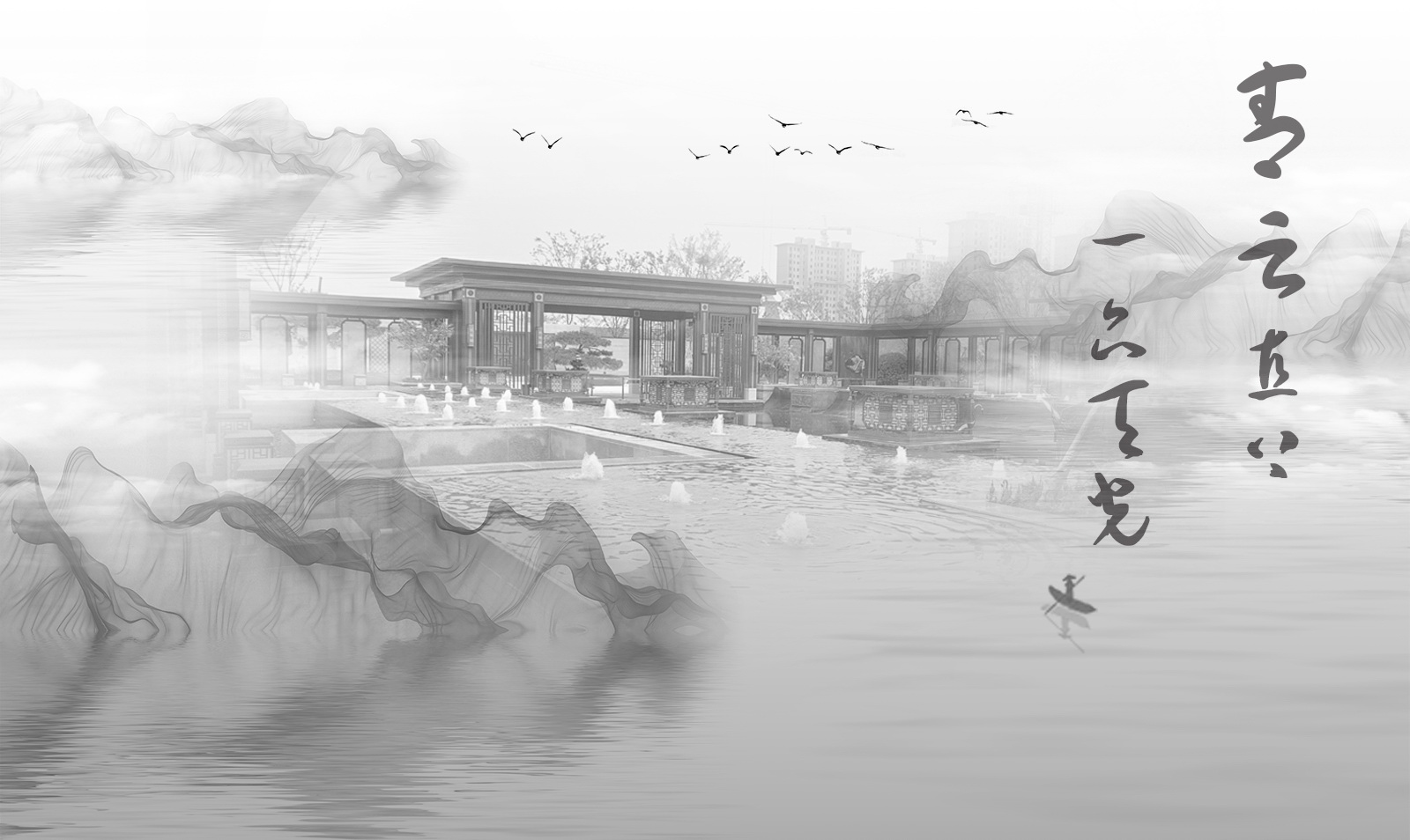 以山、水、亭、草坪的虛實(shí)變化描繪出一幅曠遠(yuǎn)之境 。