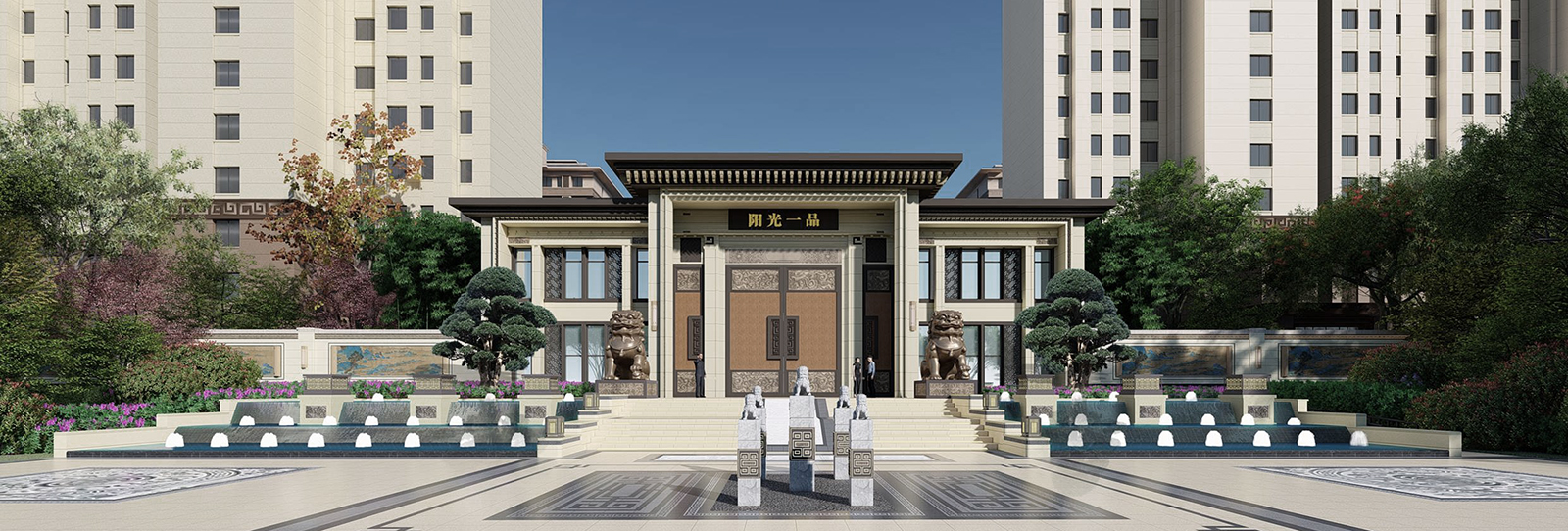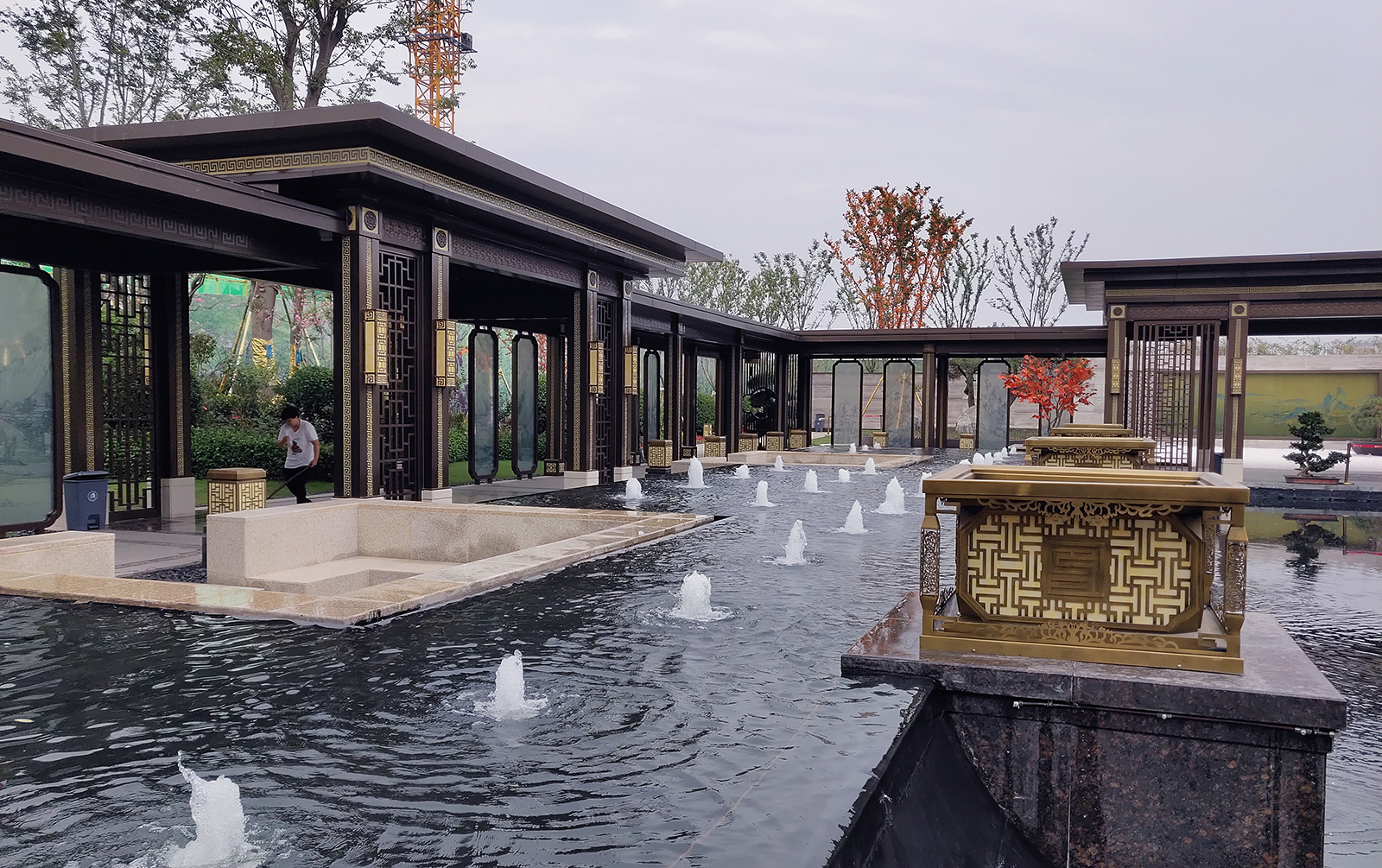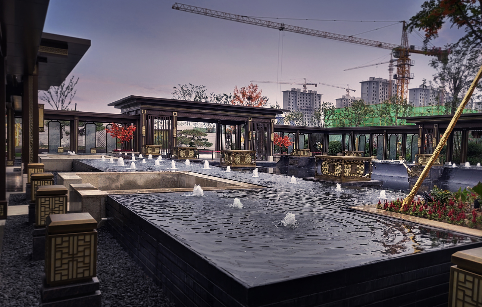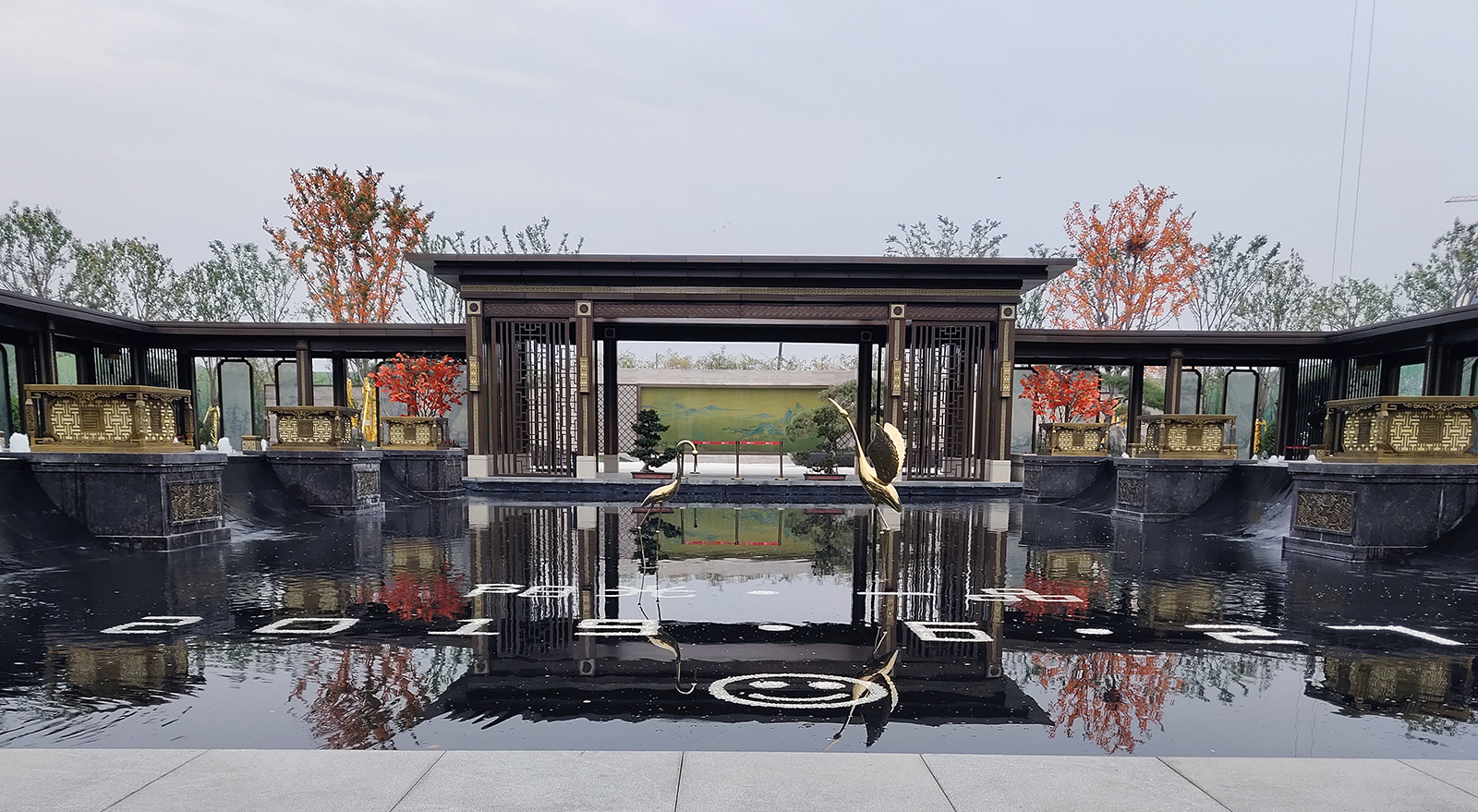 鏡面水景輕靈、優(yōu)雅、致韻;雙排四座宮燈雕琢萬字符,寓意前程萬福。