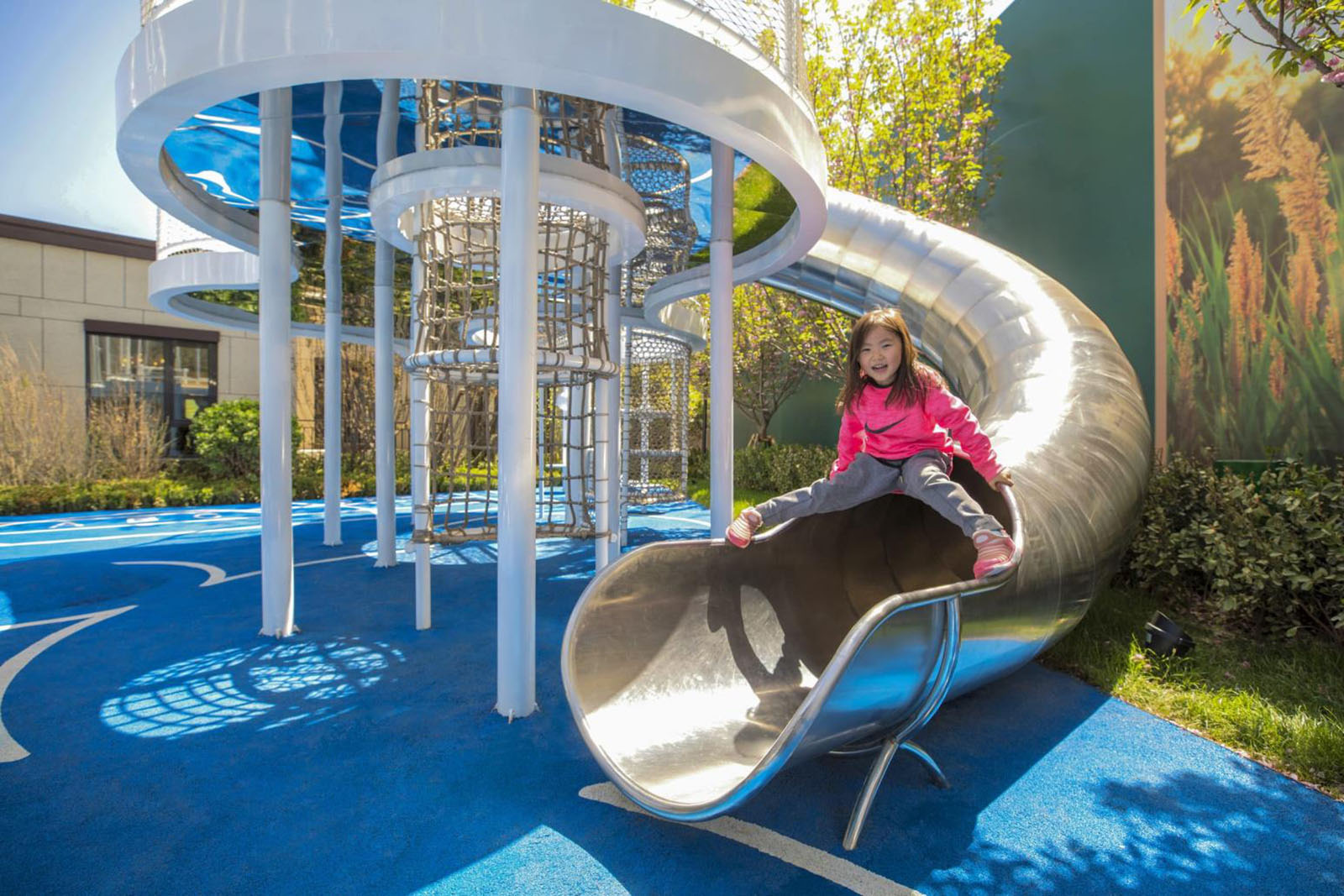 童夢樂園以“云鏡幻夢” 為設計主題,特別設計的云鏡主題滑梯為主景,讓兒童感受云與天空的幻夢鏡光倒影,配置夢幻風車、互動風車、飛行搖搖馬,如夢似幻,以幸福棲居、親子同樂為核心內涵,創造家長與兒童互動娛樂活動為主題的親子空間,深入研究兒童的戶外活動方式與形態,創造兒童友好社區,兼顧長輩的看護需求,通過新穎的互動性設計,調動兒童參與積極性,著力打造一個樂園級別的戶外兒童樂園。