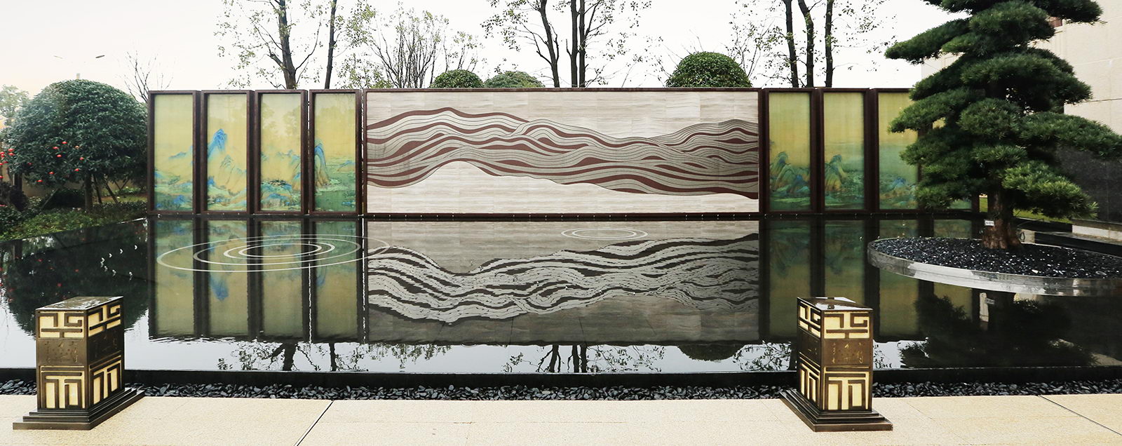 以真絲絹布打印青山綠水長軸,運用現代工藝,將絹畫夾在玻璃中間,中間景墻墻以高端法國木紋為背景,配合鋁板材質雕刻的山脈紋理,結合現代鏡面水景,利用朝夕的光影變化,仿佛古今交映,再現浩瀚江山壯美之境。