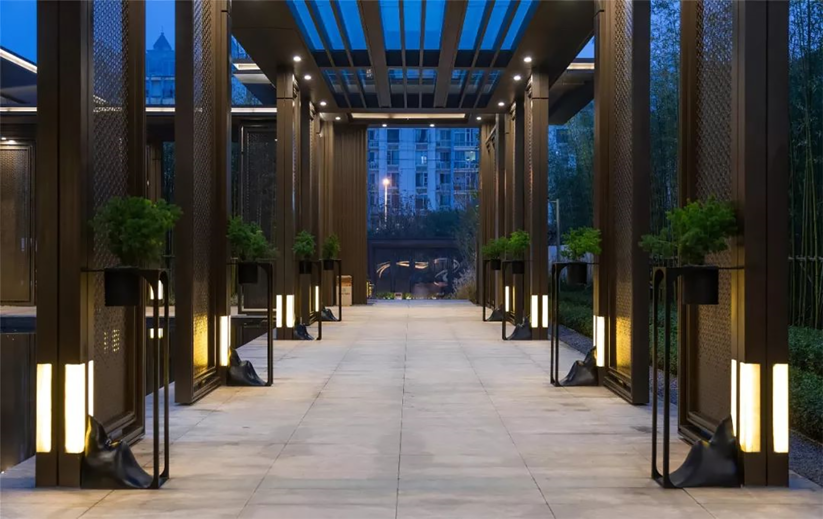 一進(jìn)院作為第一重院境,門頭雍容大氣,入口地面水墨紋特色鋪裝丹青淡抹,一進(jìn)院內(nèi)如華燈初上,墨韻初開,地面盛世華府紫銅字刻盡顯尊貴雅奢氣質(zhì)。