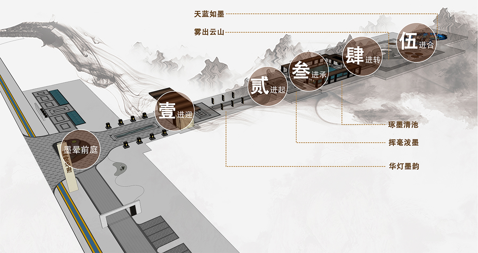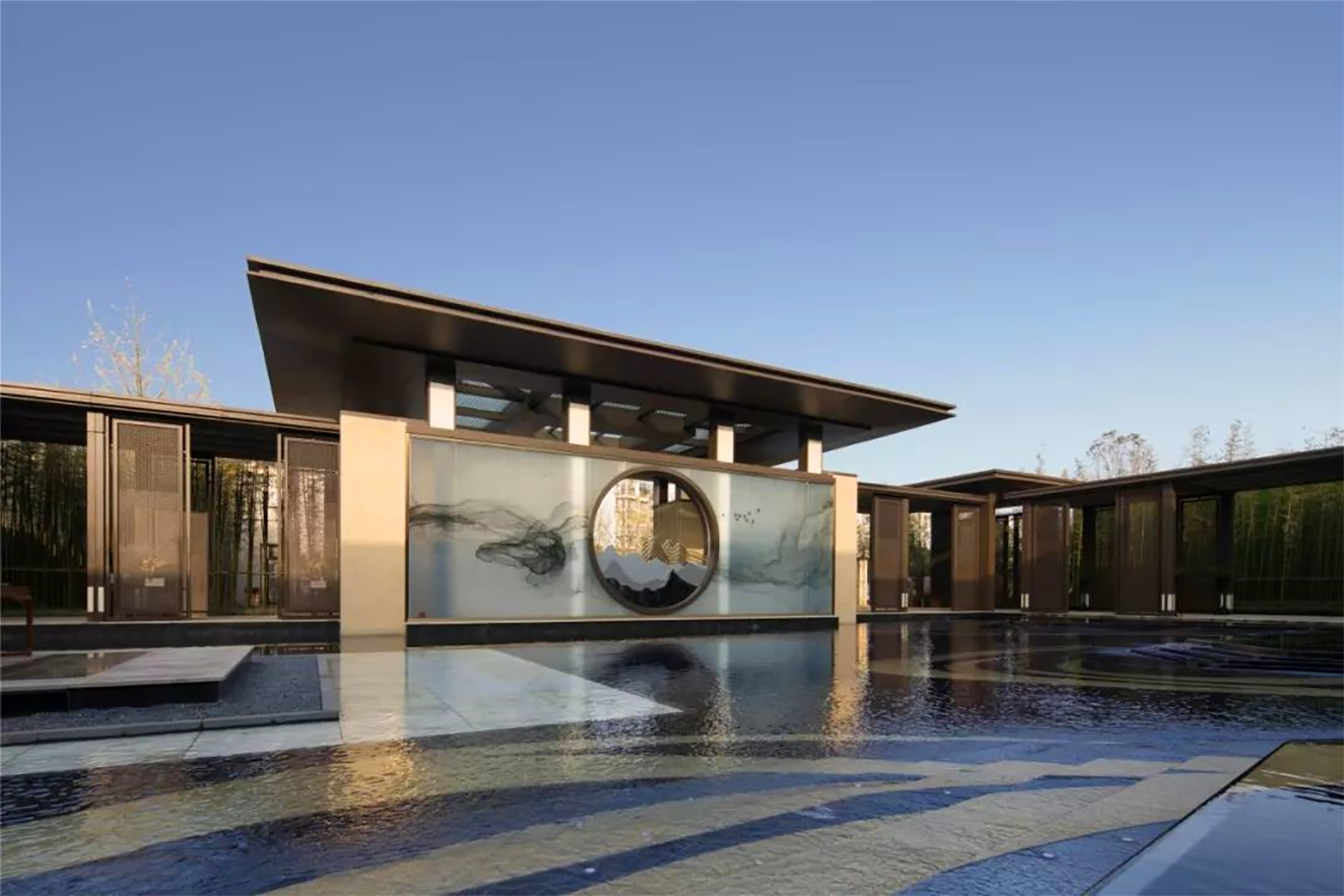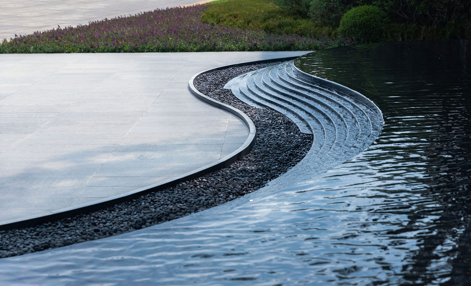 售樓處前場(chǎng)以硯石流墨為視覺焦點(diǎn),黑色肌理猶如一方硯臺(tái),水景層層疊疊,如水墨輕流,水墨文鋪裝如丹青一抹煙雨濃,墨香氤氳氣韻生,不只是宣紙上走筆才能暈染出水墨的虛幻與自由。